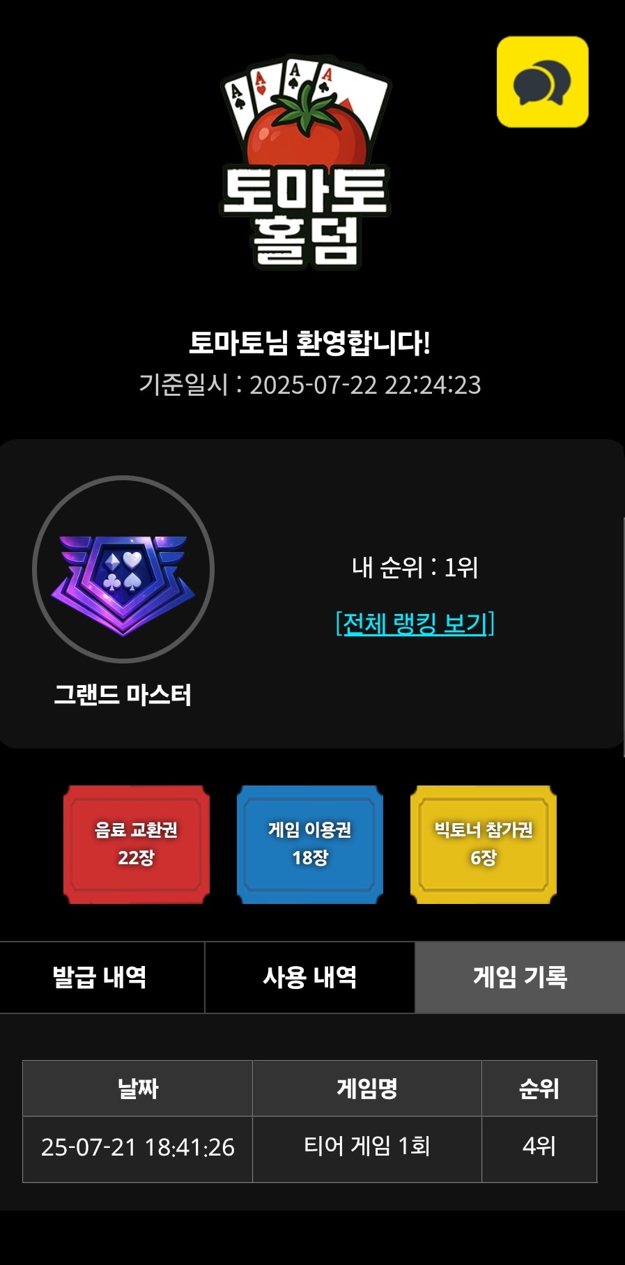 발권내역,사용내역,게임내역 및 설정에 따라